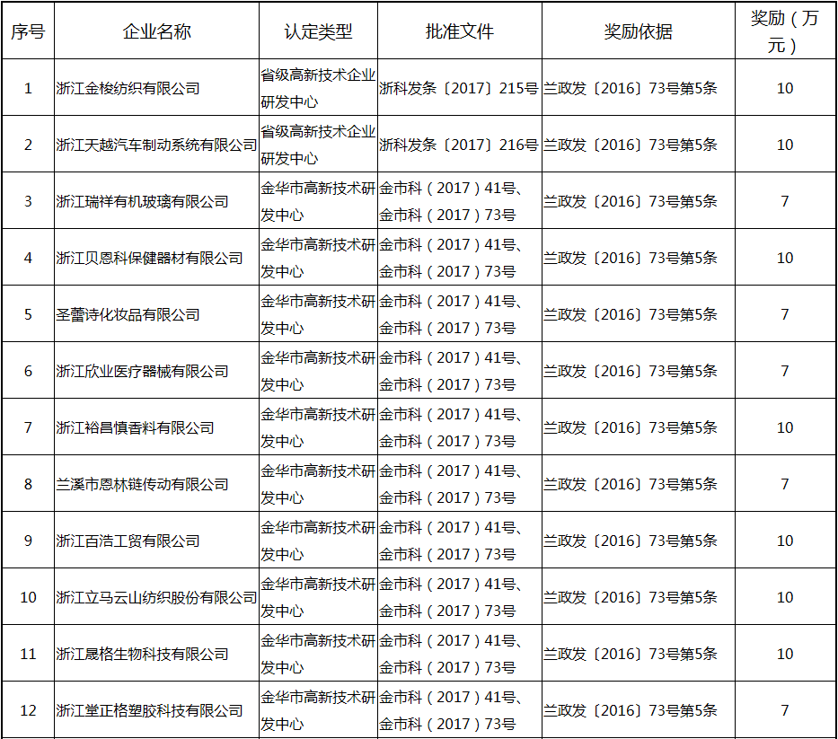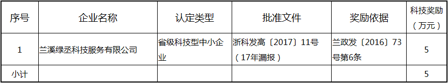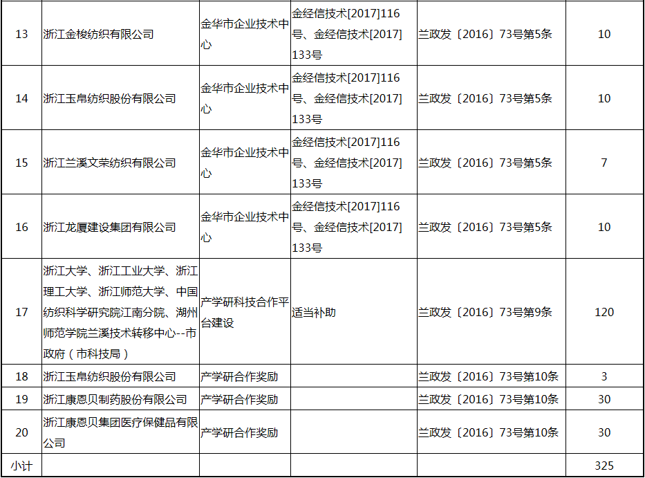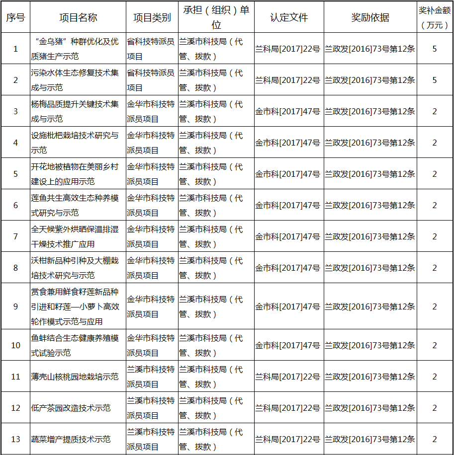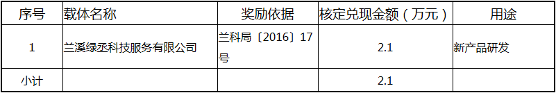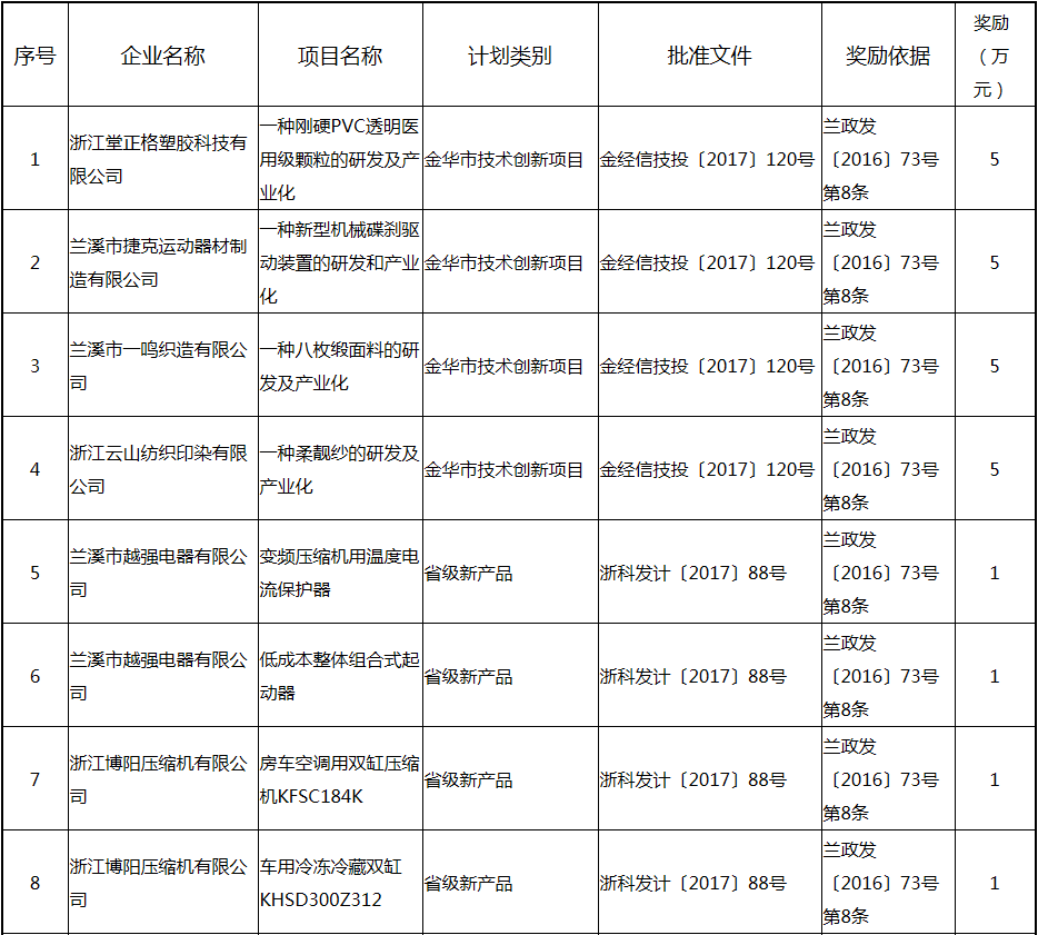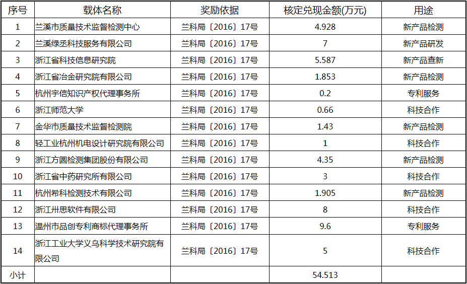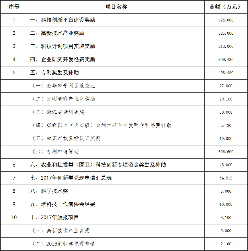 根據(jù)《關(guān)于實(shí)施創(chuàng)新驅(qū)動(dòng)戰(zhàn)略大力推進(jìn)大眾創(chuàng)業(yè)萬(wàn)眾創(chuàng)新的若干意見(jiàn)》(蘭政發(fā)〔2016〕73號(hào))和《蘭溪市科技創(chuàng)新券實(shí)施管理辦法》(蘭科局〔2016〕17號(hào))等文件精神 聯(lián)系電話:88840742 附件:2017年度科技創(chuàng)新專項(xiàng)資金獎(jiǎng)勵(lì)及補(bǔ)助方案 附件 2017年度科技創(chuàng)新專項(xiàng)資金獎(jiǎng)勵(lì)及補(bǔ)助方案 一、科技創(chuàng)新平臺(tái)建設(shè)獎(jiǎng)勵(lì)(325萬(wàn)元) 二、高新技術(shù)產(chǎn)業(yè)獎(jiǎng)勵(lì)(525萬(wàn)元) 三、科技計(jì)劃項(xiàng)目實(shí)施獎(jiǎng)勵(lì)(213萬(wàn)元) 四、企業(yè)研究開(kāi)發(fā)經(jīng)費(fèi)獎(jiǎng)勵(lì)(809.48萬(wàn)元) 五、專利獎(jiǎng)勵(lì)及補(bǔ)助(458.43) (一) 金華市專利示范企業(yè) (二) 發(fā)明專利產(chǎn)業(yè)化獎(jiǎng)勵(lì) (三) 浙江省專利金獎(jiǎng) (四) 省級(jí)以上(含省級(jí))專利示范企業(yè)發(fā)明專利年費(fèi)補(bǔ)助 (五) 知識(shí)產(chǎn)權(quán)貫標(biāo)認(rèn)證獎(jiǎng)勵(lì) (六) 專利申請(qǐng)資助 六、農(nóng)業(yè)和社發(fā)類(醫(yī)衛(wèi))科技創(chuàng)新專項(xiàng)資金獎(jiǎng)勵(lì)及補(bǔ)助(48萬(wàn)元) 七、2017年創(chuàng)新券兌現(xiàn)申請(qǐng)匯總表(54.513萬(wàn)元) 八、科學(xué)技術(shù)獎(jiǎng)(5萬(wàn)元) 九、老科技工作者協(xié)會(huì)經(jīng)費(fèi)(10萬(wàn)元) 十、2017年漏報(bào)項(xiàng)目(8.1萬(wàn)元) (一) 高新技術(shù)產(chǎn)業(yè)獎(jiǎng)勵(lì) (二) 2016創(chuàng)新券兌現(xiàn)申請(qǐng) (三) 2016年度發(fā)明專利獎(jiǎng)勵(lì)