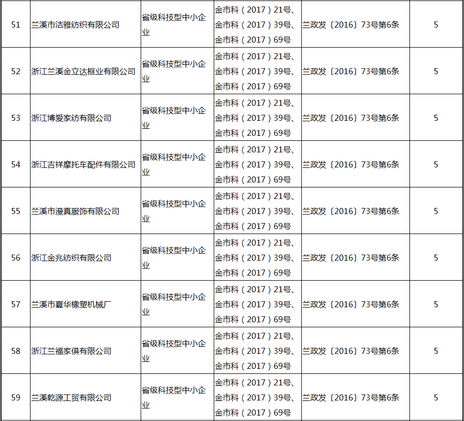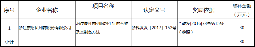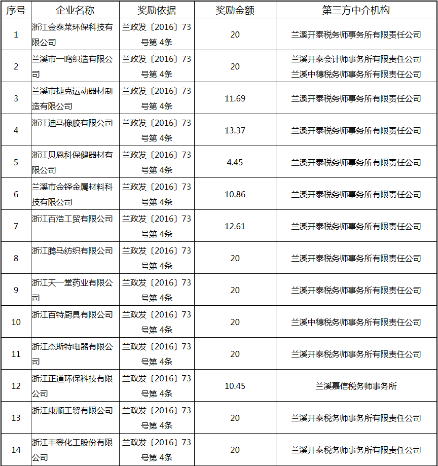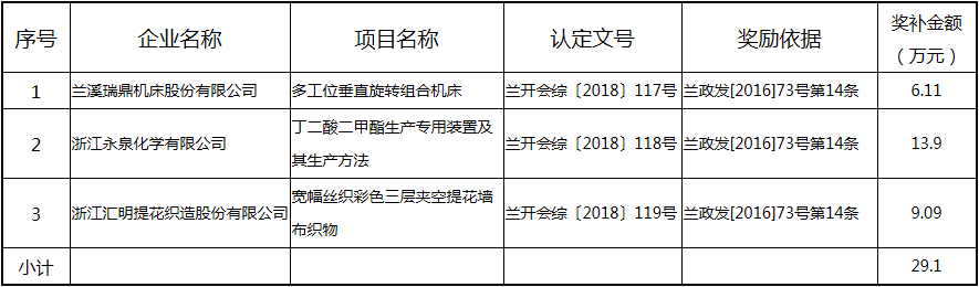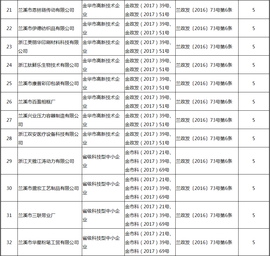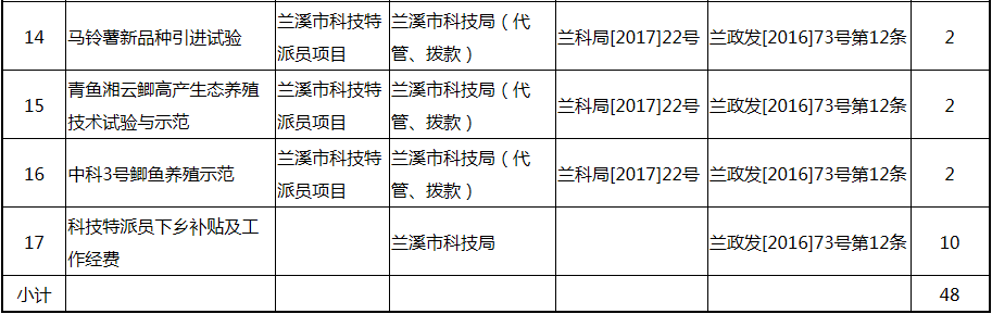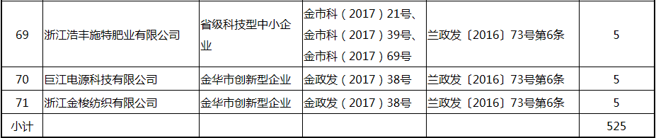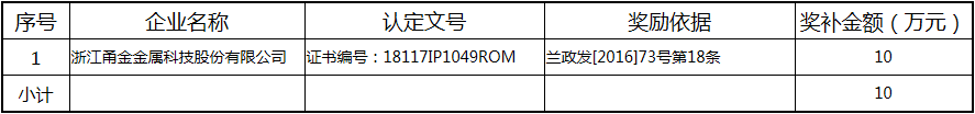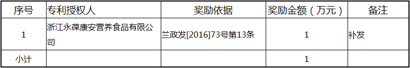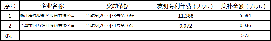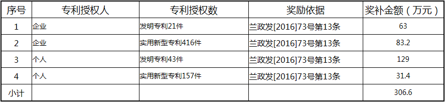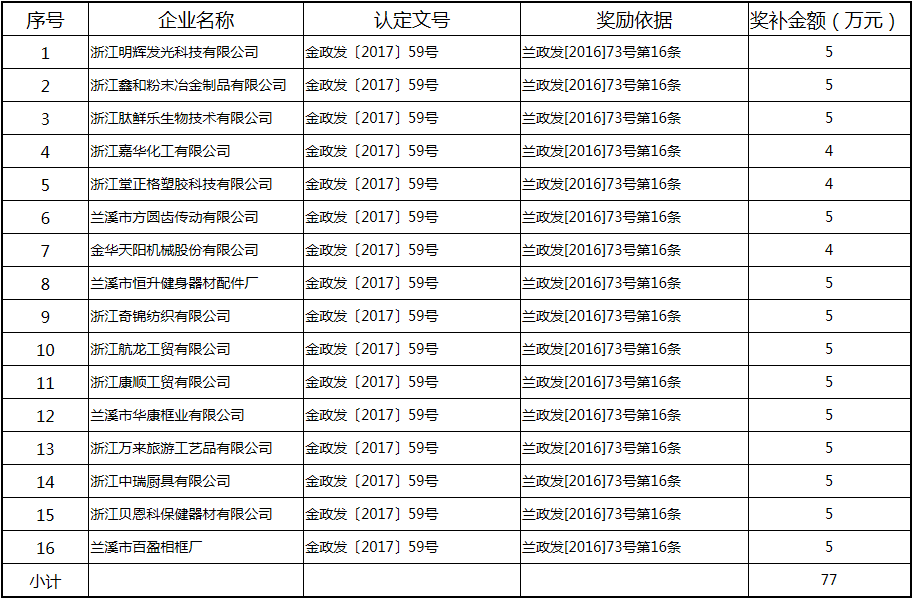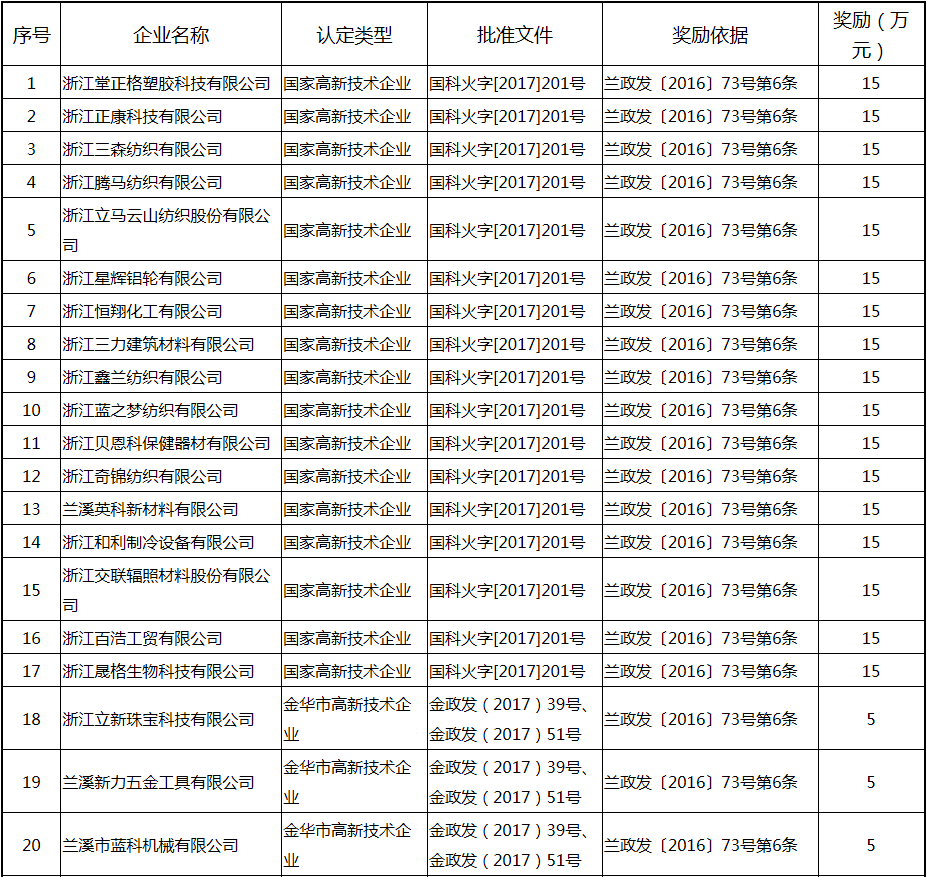 根據(jù)《關(guān)于實(shí)施創(chuàng)新驅(qū)動(dòng)戰(zhàn)略大力推進(jìn)大眾創(chuàng)業(yè)萬(wàn)眾創(chuàng)新的若干意見(jiàn)》(蘭政發(fā)〔2016〕73號(hào))和《蘭溪市科技創(chuàng)新券實(shí)施管理辦法》(蘭科局〔2016〕17號(hào))等文件精神 聯(lián)系電話:88840742 附件:2017年度科技創(chuàng)新專項(xiàng)資金獎(jiǎng)勵(lì)及補(bǔ)助方案 附件 2017年度科技創(chuàng)新專項(xiàng)資金獎(jiǎng)勵(lì)及補(bǔ)助方案 一、科技創(chuàng)新平臺(tái)建設(shè)獎(jiǎng)勵(lì)(325萬(wàn)元) 二、高新技術(shù)產(chǎn)業(yè)獎(jiǎng)勵(lì)(525萬(wàn)元) 三、科技計(jì)劃項(xiàng)目實(shí)施獎(jiǎng)勵(lì)(213萬(wàn)元) 四、企業(yè)研究開(kāi)發(fā)經(jīng)費(fèi)獎(jiǎng)勵(lì)(809.48萬(wàn)元) 五、專利獎(jiǎng)勵(lì)及補(bǔ)助(458.43) (一) 金華市專利示范企業(yè) (二) 發(fā)明專利產(chǎn)業(yè)化獎(jiǎng)勵(lì) (三) 浙江省專利金獎(jiǎng) (四) 省級(jí)以上(含省級(jí))專利示范企業(yè)發(fā)明專利年費(fèi)補(bǔ)助 (五) 知識(shí)產(chǎn)權(quán)貫標(biāo)認(rèn)證獎(jiǎng)勵(lì) (六) 專利申請(qǐng)資助 六、農(nóng)業(yè)和社發(fā)類(醫(yī)衛(wèi))科技創(chuàng)新專項(xiàng)資金獎(jiǎng)勵(lì)及補(bǔ)助(48萬(wàn)元) 七、2017年創(chuàng)新券兌現(xiàn)申請(qǐng)匯總表(54.513萬(wàn)元) 八、科學(xué)技術(shù)獎(jiǎng)(5萬(wàn)元) 九、老科技工作者協(xié)會(huì)經(jīng)費(fèi)(10萬(wàn)元) 十、2017年漏報(bào)項(xiàng)目(8.1萬(wàn)元) (一) 高新技術(shù)產(chǎn)業(yè)獎(jiǎng)勵(lì) (二) 2016創(chuàng)新券兌現(xiàn)申請(qǐng) (三) 2016年度發(fā)明專利獎(jiǎng)勵(lì)