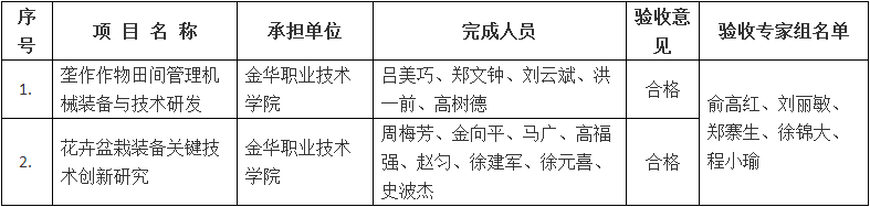 根據(jù)《金華市級(jí)科技計(jì)劃項(xiàng)目驗(yàn)收管理辦法》(金市科字〔2015〕83號(hào))規(guī)定,現(xiàn)將金華職業(yè)技術(shù)學(xué)院承擔(dān)的《壟作作物田間管理機(jī)械裝備與技術(shù)研發(fā)》等市級(jí)科技計(jì)劃項(xiàng)目驗(yàn)收結(jié)果予以公示,接受社會(huì)監(jiān)督 金華市科技局農(nóng)業(yè)與社會(huì)發(fā)展處 聯(lián)系電話:82469788 地址:金華市雙龍南街801號(hào)市府大樓主樓728室 金華市級(jí)科技計(jì)劃項(xiàng)目驗(yàn)收結(jié)果公示清單 ,公示期從2018年7月23日至2018年7月29日止