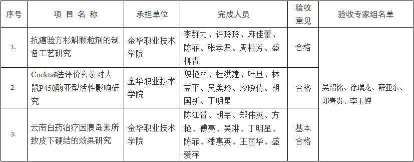 根據(jù)《金華市級(jí)科技計(jì)劃項(xiàng)目驗(yàn)收管理辦法》(金市科字〔2015〕83號(hào))規(guī)定,現(xiàn)將金華職業(yè)技術(shù)學(xué)院承擔(dān)的《抗癌驗(yàn)方杉斛顆粒劑的制備工藝研究》市級(jí)科技計(jì)劃項(xiàng)目驗(yàn)收結(jié)果予以公示,接受社會(huì)監(jiān)督