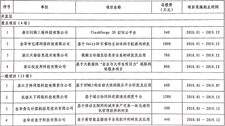 件和信息服務(wù)產(chǎn)業(yè)基地能力提升工作的通知)) (浙經(jīng)信軟件(2018) 53 號(hào))、《浙江省工業(yè)和信息化發(fā)展財(cái)政專(zhuān)項(xiàng)資金使用管理暫行辦法)) (浙財(cái)企(2014) 189 號(hào))以及《關(guān)于做好2018 年省軟件和信息服務(wù)產(chǎn)業(yè)基地能力提升專(zhuān)項(xiàng)資金項(xiàng)目的通知)) (金網(wǎng)經(jīng)發(fā)(2018) 13 號(hào))文件精神,經(jīng)申報(bào)單位自主申報(bào),金華開(kāi)發(fā)區(qū)網(wǎng)絡(luò)經(jīng)濟(jì)局推薦上報(bào),市網(wǎng)絡(luò)經(jīng)濟(jì)局根據(jù)省財(cái)政專(zhuān)項(xiàng)扶持資金支持重點(diǎn)方向,組織專(zhuān)家對(duì)區(qū)推薦上報(bào)的項(xiàng)目從項(xiàng)目實(shí)施內(nèi)容、項(xiàng)目技術(shù)創(chuàng)新、項(xiàng)目市場(chǎng)前景、項(xiàng)目經(jīng)濟(jì)和社會(huì)效益等方面進(jìn)行了綜合評(píng)審并經(jīng)公示、復(fù)核,確定浙江閃鑄三維科技有限公司"FlashForge 3D 打印云平臺(tái)"等19個(gè)項(xiàng)目入選2018年省軟件和信息服務(wù)產(chǎn)業(yè)基地能力提升專(zhuān)項(xiàng)資金項(xiàng)目計(jì)劃,其中重點(diǎn)項(xiàng)目4 個(gè)、一般項(xiàng)目15 個(gè),現(xiàn)印發(fā)給你們。建議重點(diǎn)項(xiàng)目扶持資金額按高于一般項(xiàng)目扶持資金額30%左右安排。請(qǐng)你們參照《浙江省信息服務(wù)業(yè)發(fā)展專(zhuān)項(xiàng)資金項(xiàng)目驗(yàn)收管理暫行辦法)) (浙經(jīng)信軟件(2011) 601 號(hào))要求,及時(shí)通知各項(xiàng)目承擔(dān)單位簽訂項(xiàng)目合同書(shū),并會(huì)同區(qū)財(cái)政部門(mén)做好資金落實(shí)、業(yè)務(wù)指導(dǎo)和監(jiān)督檢查工作。