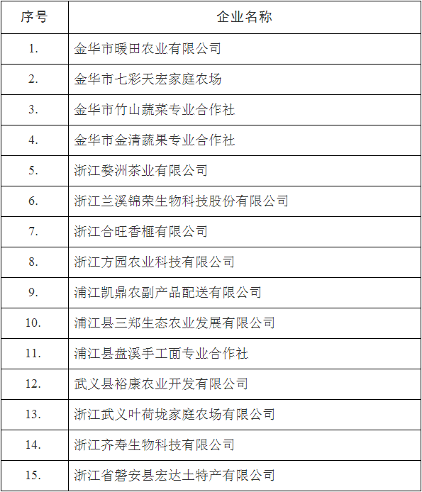 同意認(rèn)定“金華市暖田農(nóng)業(yè)有限公司”等15家企業(yè)為2018年度金華市農(nóng)業(yè)科技企業(yè),現(xiàn)予公布。